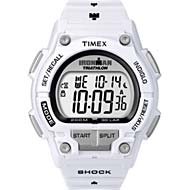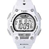 Diving watch, Digital quartz movement, Positive (dark-on-light) numbers, 1/100-second digital chronograph with available 30-lap memory measures lap time/split time with on-the-fly recall feature, Countdown timer, Alarm mode, INDIGLO® night-light, Digital day-date-and-month display, Digital grey dial, White resin strap with black logos and brushed silver-tone metal buckle, White resin bezel with black print and grey resin selector buttons, Shock resistant white resin round case, Grey resin selector buttons, Stainless steel screw-in caseback, Mineral crystal, 200 meters/660 feet water resistantYou can buy the special prices of "Timex Ironman Shock Resistant 30-lap Vivid Grey Dial Men's watch #T5K429" at Timex Ironman Watch Reviews.