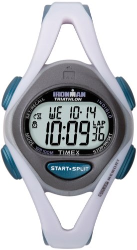 The Ironman Triathlon 50-Lap Sleek watch is stylish enough for the weekend warrior and technical enough for the extreme athlete. Equipped with a 50-lap memory chronograph, this sports timepiece also features a 100-hour chronograph with lap/split, a lap counter, three alarms, two time zones, forward or backward setting, built-in setting reminders, and an hourly chime. Perfect for night or day, the Timex has an all-day white reflector display and an Indiglo night light. This women's watch is made with a stainless steel case and a resin bezel and band. The gray dial has a digital time display and a day, date, and month calendar. Water resistant to 330 feet, the Ironman is even a great choice for swimmers and divers. It comes with two-year battery life.You can buy the special prices of "Timex Women's T5K005 Ironman Sleek 50-Lap Resin Strap Watch" at Timex Ironman Watch Reviews.
