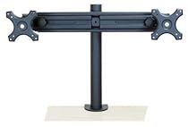 This is a brand new product under our Super Line. This is a Heavy Duty Dual monitor stand. This monitor stand clamps to your desk. This Super Dual Straight Arm Monitor stand will hold 26" LCD Monitors with room to spare. The arms slide in and out to accommodate different sizes. Each mount can be tilted left, right, up, and down. You can also rotate each monitor from portrait to landscape on the fly. Max width fully extended 31". This measurement is measuring center of the mount on one side to the center of the mount on the other side. Minimum width 22". This measurement is measuring center of the mount on one side to the center of the mount on the other side. The measurement of the monitor to the pole is 4.5 inches. Height is 18" SPECIFICATIONS Fits 75 x 75 mm / 100 x 100 mm VESA-compliant monitors -- Installs on horizontal surfaces up to 4" thick, PACKAGE CONTENTS C-clamp with thumb screw and mounting screws -- Monitor mounting screws (8) -- Installation hardware with in! structions and hex tool If you want no spaces between your monitors we recommend using this stand with 19" wide screen monitors and larger. Please make sure your desk is made of a solid surface.